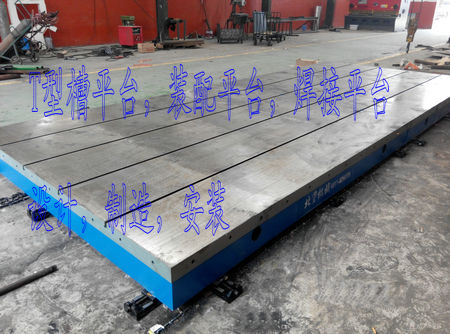 我公司為保定客戶生產的T型槽焊接平臺,2件2500*4000mm的T型槽平臺,拼接成2500*8000mm的焊接裝配平臺.表面帶有刻度線,間距200*200mm。應客戶要求在平臺周邊間距250mm均布M20的螺栓孔40個。